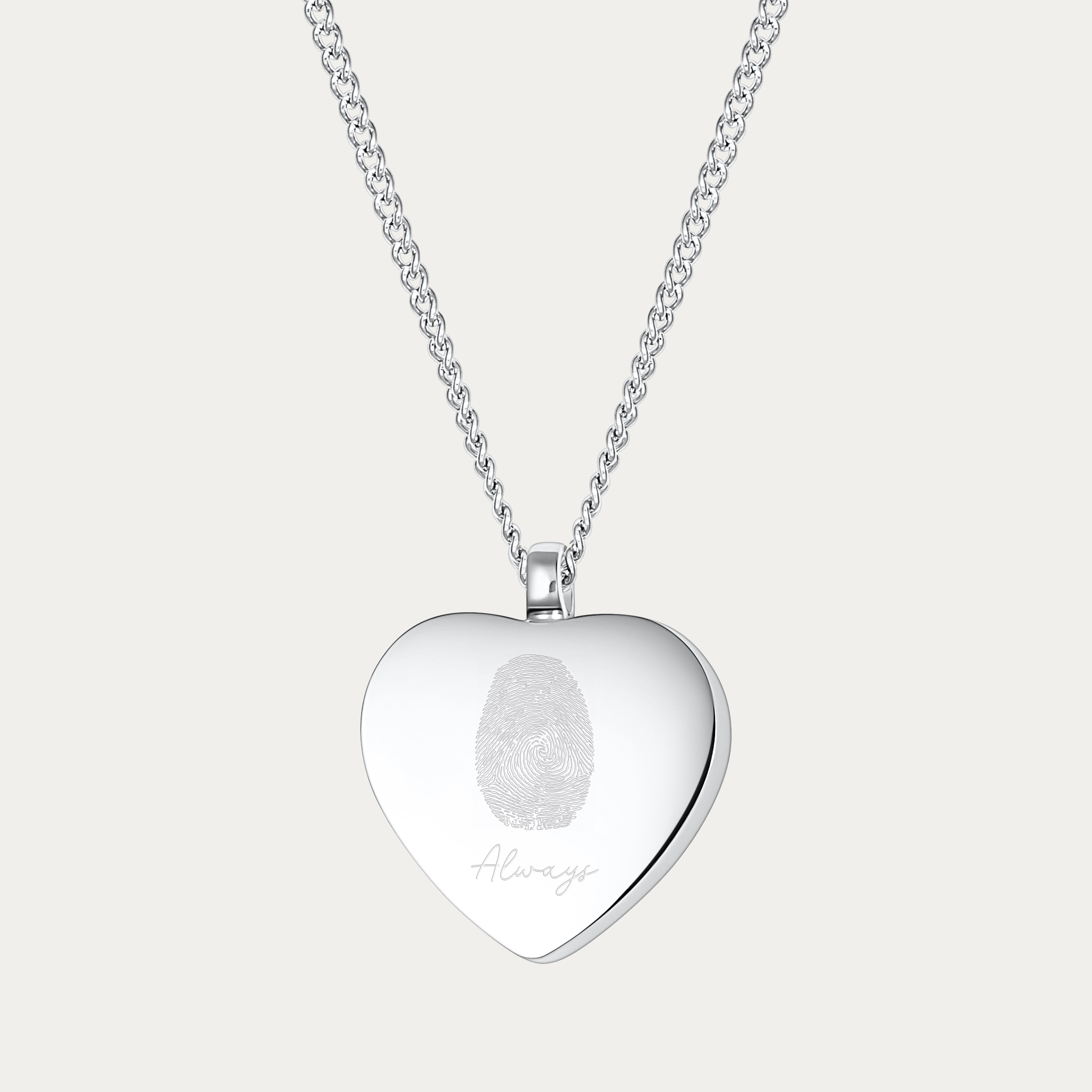 Hold them close, always. Our Fingerprint Engraved Heart Urn Necklace is a deeply personal keepsake that captures the unique touch of someone special. Each pendant is precisely engraved with a real fingerprint, creating a one-of-a-kind piece that embodies presence, memory, and love. Whether it's a gift to commemorate a loved one, a memorial, or a meaningful gesture for a partner or parent, this necklace transforms a simple impression into a timeless treasure. Made from waterproof, hypoallergenic materials, it's designed for everyday wear and lasting sentiment.