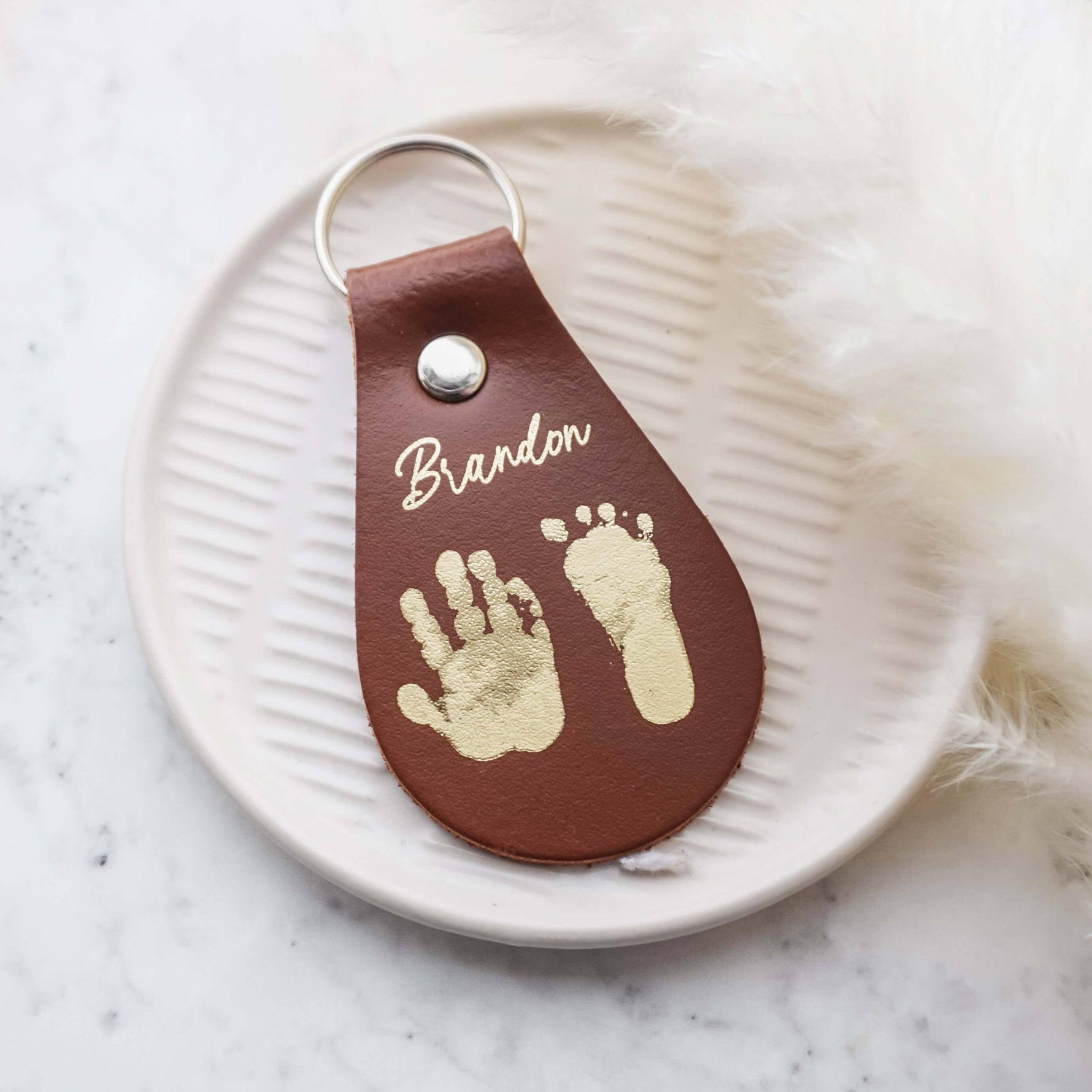 Express your love and commitment to family with a one-of-a-kind Handprint/Footprint Leather Keyring. Personalize it with precious gold embossed hand& footprints for an unforgettable way to carry your loved one with you wherever you go! Delight in the unique beauty of its natural leather material, crafted for a lifetime of memories.