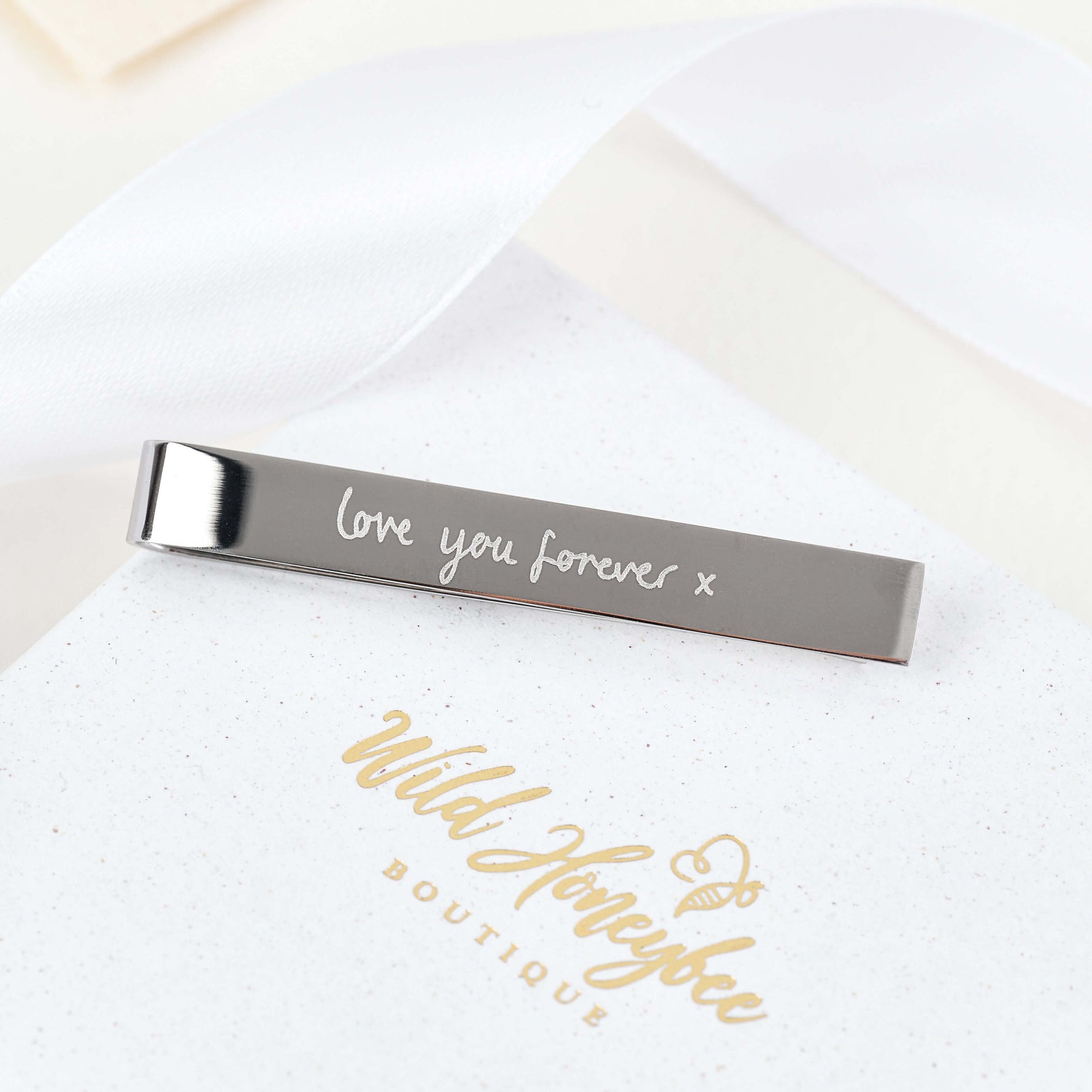 Capture a treasured memory with our Handwriting Engraved Tie Clip — A timeless keepsake designed to hold a personal message close to your heart. Each Tie Clip is carefully engraved with the actual handwriting of your loved one, making it a truly unique and meaningful piece. Whether it's a signature, a special note, or a simple "I love you," this necklace preserves the emotion behind every word. Thoughtfully crafted with waterproof and hypoallergenic materials, it is perfect for birthdays, anniversaries, memorial gifts, or special occasions.