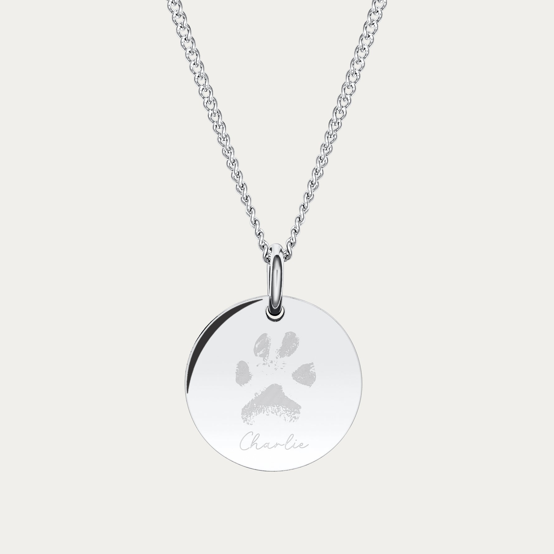 Keep their paw prints close to your heart. Our Paw Print Engraved Disc Necklace is a heartfelt tribute to the unconditional love shared with a beloved pet. Each pendant is custom engraved with your pet’s actual paw print and their name, creating a beautiful, lasting reminder of the bond you’ll always treasure. Whether celebrating a furry best friend or honouring their memory, this piece is crafted to be a timeless keepsake. Made from waterproof, hypoallergenic materials, it’s perfect for everyday wear and sentimental gifting.