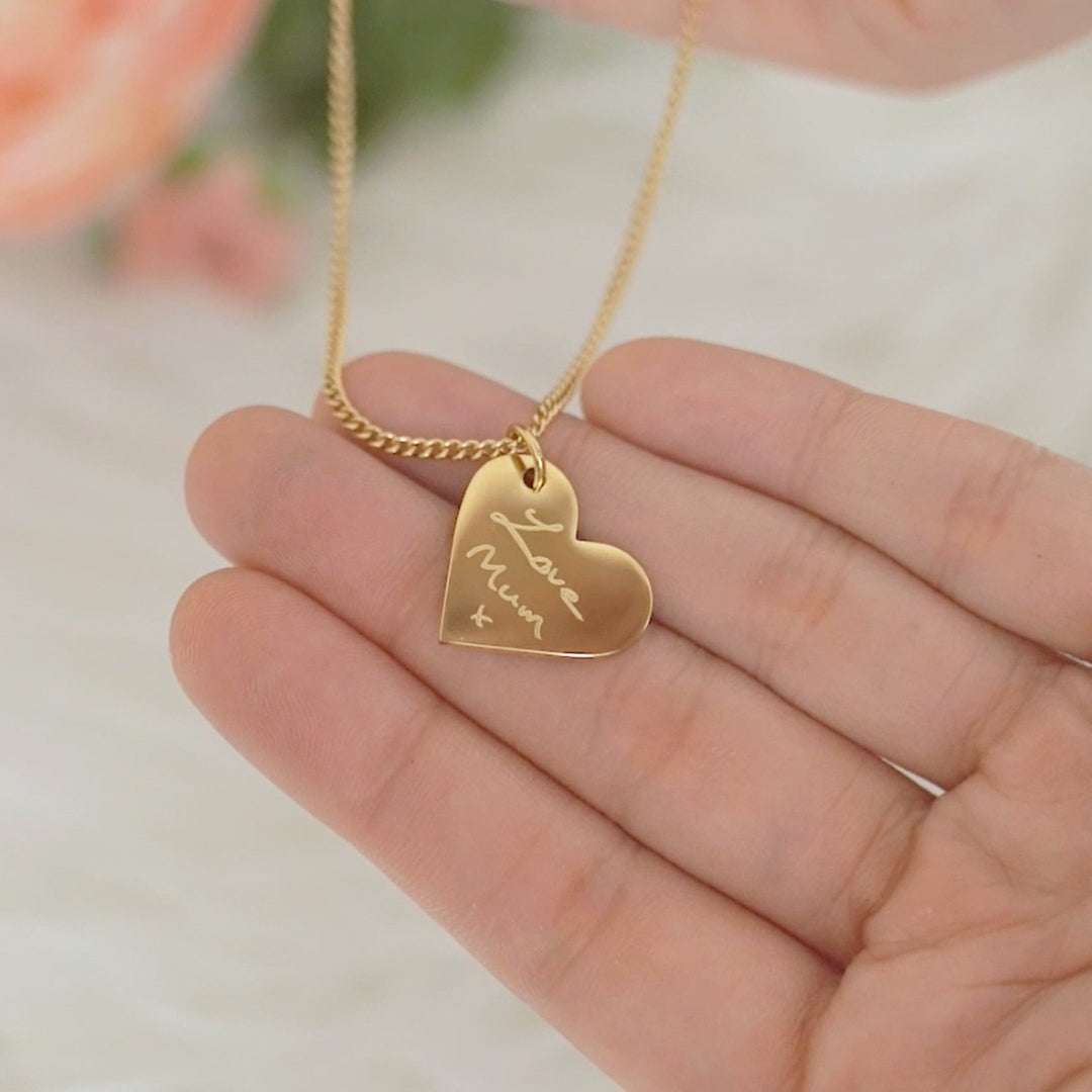Capture a treasured memory with our Handwriting Engraved Heart Necklace — A timeless keepsake designed to hold a personal message close to your heart. Each pendant is carefully engraved with the actual handwriting of your loved one, making it a truly unique and meaningful piece. Whether it's a signature, a special note, or a simple "I love you," this necklace preserves the emotion behind every word. Thoughtfully crafted with waterproof and hypoallergenic materials, it is perfect for birthdays, anniversaries, memorial gifts, or special occasions.
